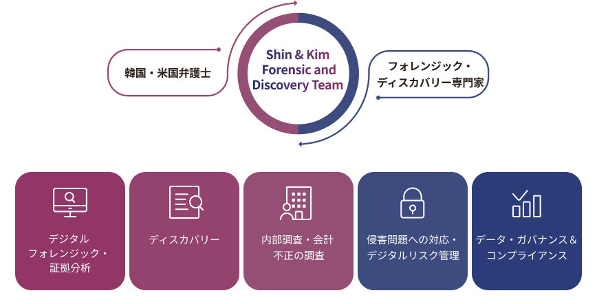 世宗は、複雑な紛争、内部調査、規制への対応に効果的に対応するため、法律専門家、デジタルフォレンジック専門家、ディスカバリー専門家が有機的に協業するワンストップ・サービスを提供致します。