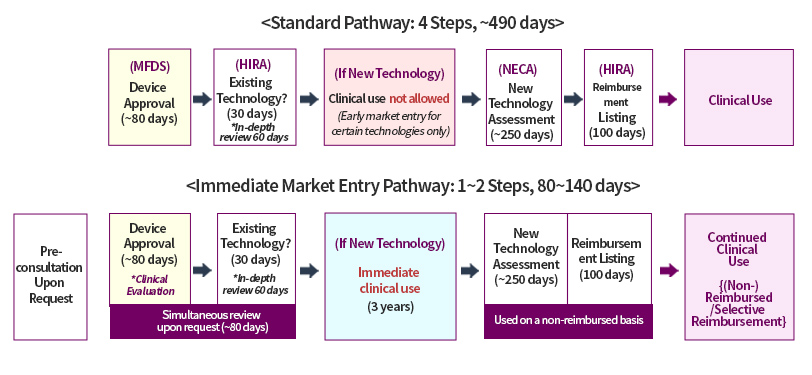 Under the standard market entry framework, medical devices are required to complete the following steps before market use: (i) approval by the MFDS (Step 1); (ii) confirmation by the Health Insurance Review and Assessment Service (“HIRA”) as to whether the technology of the medical device qualifies as an existing technology (Step 2); (iii) if confirmed not to be an existing technology, New Health Technology Assessment (“nHTA”) by the National Evidence-based Healthcare Collaborating Agency (“NECA”) (Step 3); and (iv) reimbursement listing by HIRA (Step 4). This process could take up to 490 days, with the nHTA under Step 3 alone requiring up to 250 days to assess the safety and efficacy of new medical technologies.