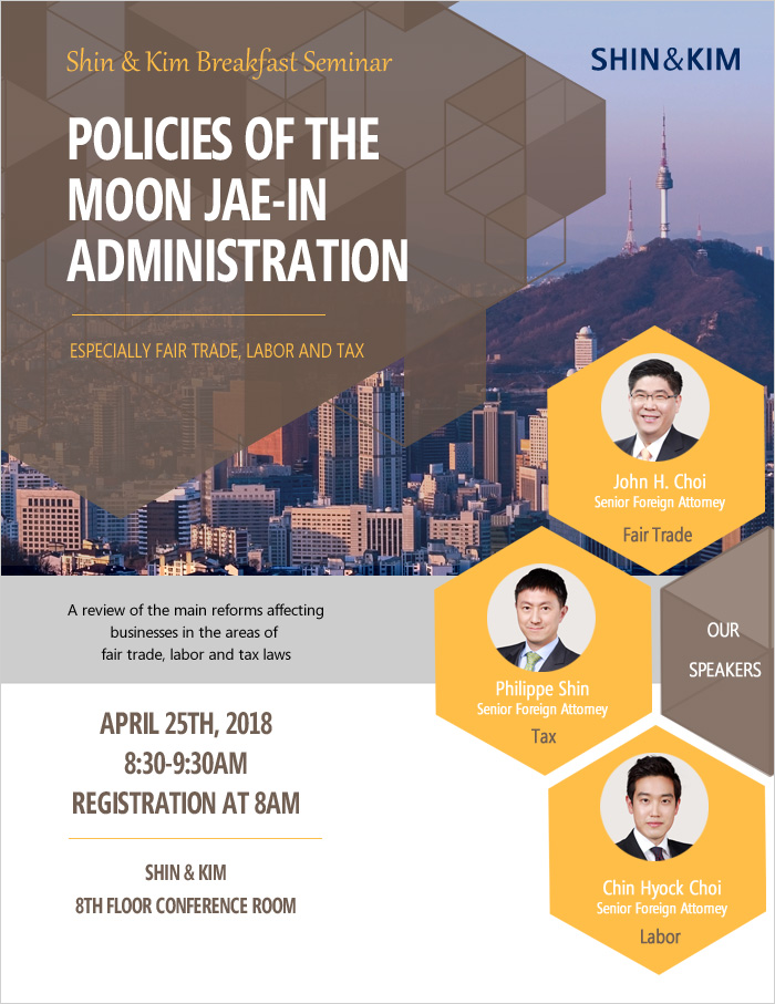 Shin & Kim would like to invite you to a Special Breakfast Seminar to be held on April 25 from 8:30-9:30AM. This seminar will deal with the policies of the Moon Jae-In Administration and its program, what has been done during the first ten months and what is announced for the future. The speakers will share their insights on the main reforms affecting businesses in the areas of Fair Trade, Labor and Tax Laws.