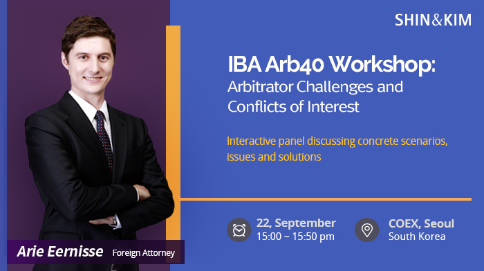 Arie Eernisse, a senior associate (foreign attorney) in Shin & Kim’s International Dispute Resolution Practice Group, will participate in a panel discussion at the “IBA Arb40 Workshop: Arbitrator Challenges and Conflicts of Interest” taking place in conjunction with the IBA Annual Conference in Seoul on 22 September. Arie will be discussing concrete conflict scenarios, issues and solutions.